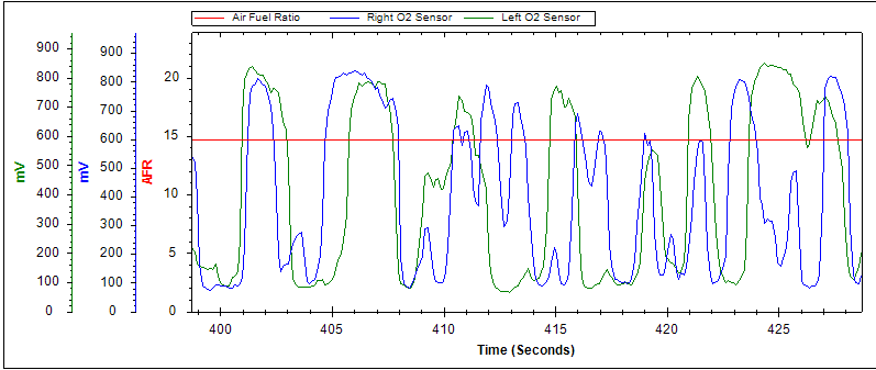 Both O2 sensors start out at around 400 mV and track each other for the first 45 secs. At that point the right O2 sensor (blue trace) starts falling to around 400mV. If I rev the engine I can see the right sensor respond by increasing in voltage by about 200mV but the left sensor only increases by around 20~30mV. I would expect both sensors to track each other fairly closely however the right sensor wants to settle at around 300mV and the left sensor at 650mV. The right sensor is responsive to changes in rpms but the left sensor seems very lazy and doesn't respond much to rpm changes.