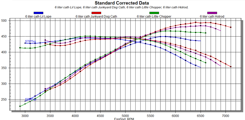 Also am considering the new chopacabra cams. 6.0 chopa is 220/228, 108+2. 6.2 chopa is 216/230, 108+2. Ported heads down the line might warrant a big intake/exhaust split. 220 is as big as ill go on the intake I think. Summit 8720 is still a consideration but the torque curves of the tight lsa cams are pretty awesome.