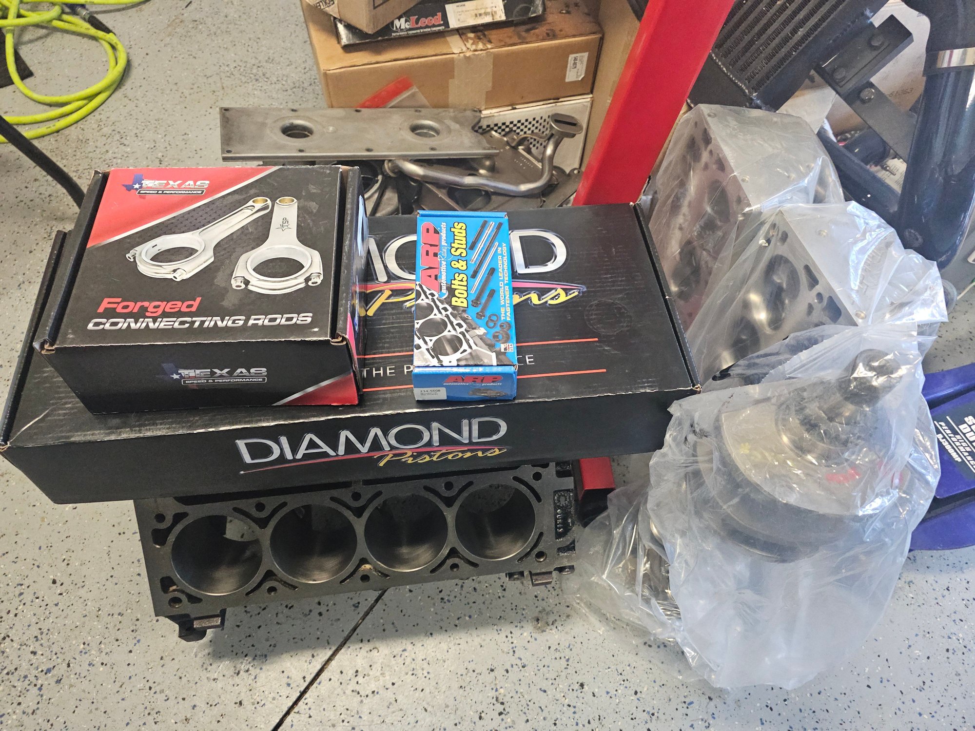 Been a while since I've updated this adventure, the crank checked out good with a polish, rods were the cheap scat forged rods only rated for 700 crank hp also. Decided to go with 2618 forged pistons from diamond and drop the compression a bit and grabbed a set of the tsp super I beams on Christmas sale. Got a set of coated calico bearings for the engine now and did the line hone for main studs. Also #8 had a really deep vertical gouge at the top of the cylinder that was in the ringland area so it got a sleeve and the rest of the cylinders a fresh hone. Finally have everything back from the machine shop to start prepping it for assembly