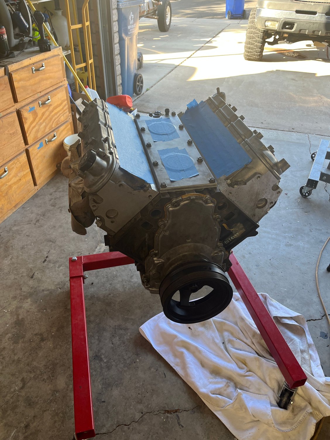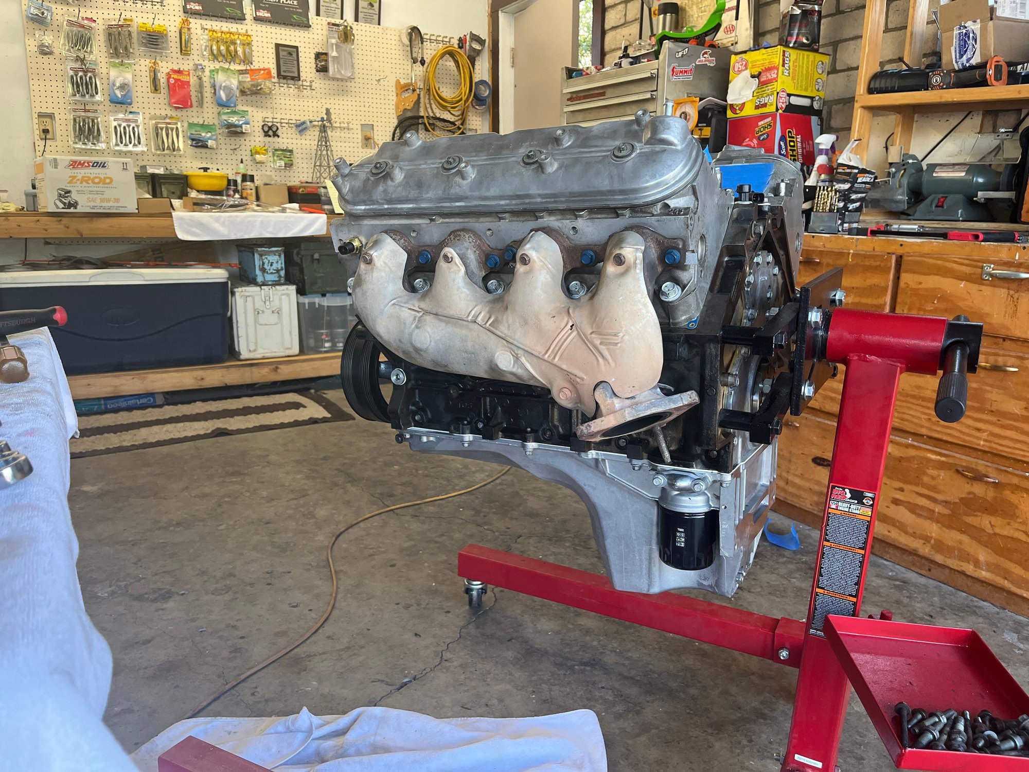 Well one last setback. I installed my 2-4 main caps backwards like an idiot. Took the crank back out, remeasured and bought a new set of bearings because two of the bearings had wear marks from installing the caps backwards. After it’s all said and done I’m getting .0027-.0028” on the mains, and .0027-.0028” on the rods. I’m very happy with the bearing clearances. After that I finished assembly on the long block. I’m pleased to report that it only takes 15 ft lbs to turn the engine over with no spark plugs. I’m fighting one last exhaust manifold flange stud, and then it goes back in the truck. It’ll be running by the end of the weekend if all goes well.