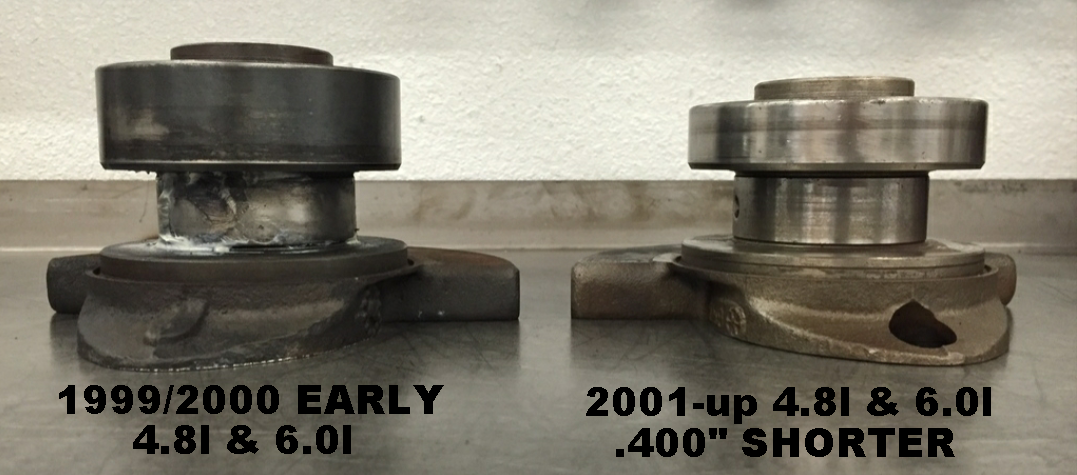 The early 4.8l & 6.0l Crank Flange info has been beaten through the ground here over the years. 1999 & 2000 Engines were this type, 6.0l was easy to spot they all had Iron Heads. Not all the 4.8l Engines had the long Flange, it was the Engines in 3/4 Ton Vans that had a 4L80E on the back of them. In 2001 GM started using the .400" Spacer on the back of the Crank with longer bolts, that means all normal Crank Flanges in everything.
