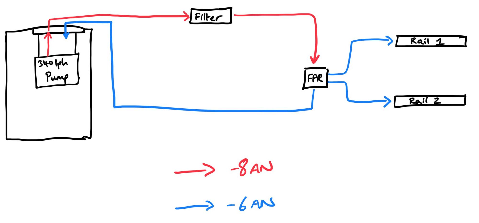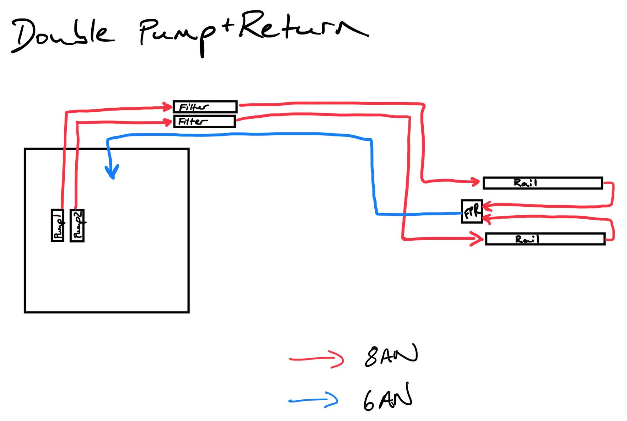 The car is a “fast road” build, so won’t be seeing prolonged track/race use. At best the odd track day here and there. Would there be any advantage to going with a full return system over this? As far as I can tell this should already give me quite a bit of headroom over the 500hp initial build aim in terms of fuel supply. Is there anything else I should be considering when designing this?