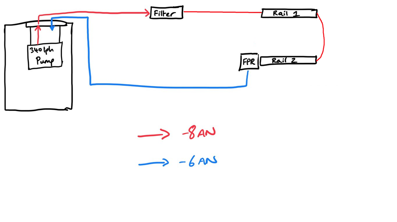 Deatschwerks DW300C (340lph, in tank) -> 8AN line -> Radium 6μm Filter -> 8AN line -> Radium MP-RA Multi-Port Fuel Regulator (1 in to 2 out + return)