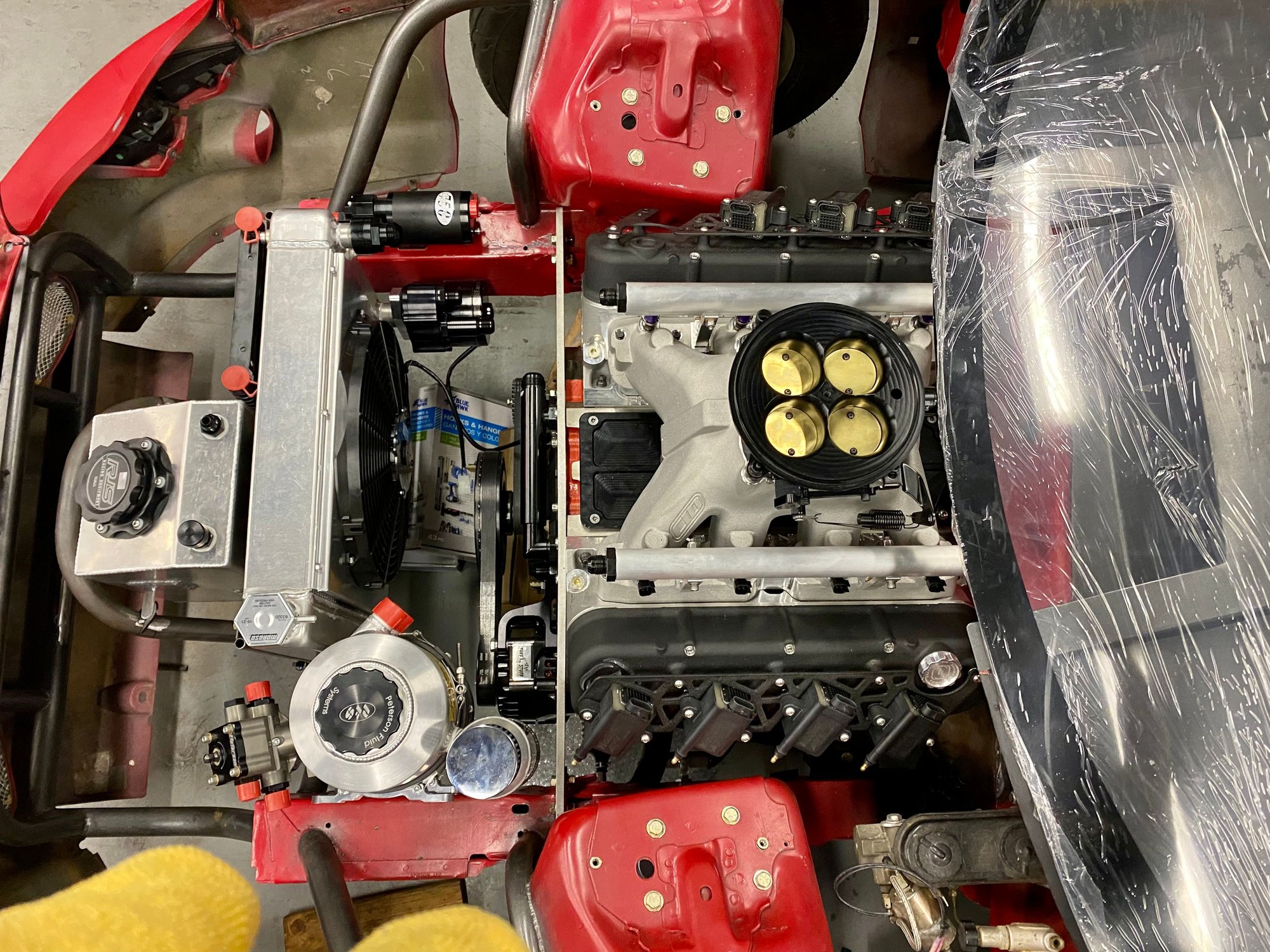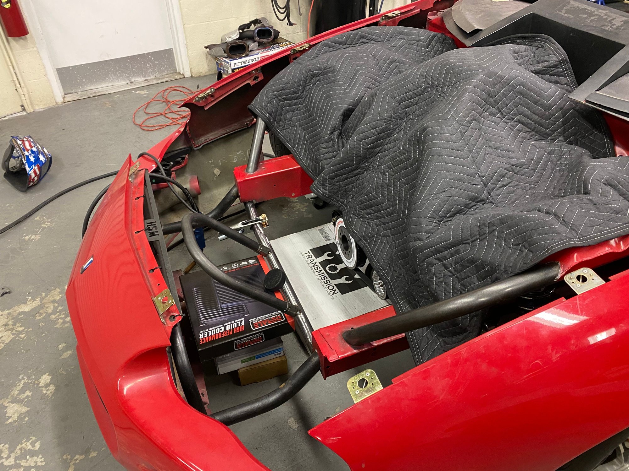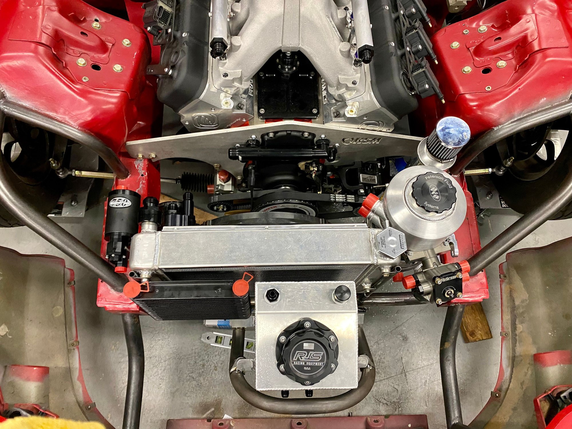 Any chance you could put the oil tank on the fire wall behind the pass side shock tower? Also move the fuel cell to the rear and put a fan on the trans cooler and put it in the rear. Oil tank to move weight to that side to compensate for the driver. Fuel cell for safety reasons in case of a front end collision. The trans cooler with no fan will not cool the trans when not in motion. Will actually heat up due to the heat from the radiator along with the fuel in the cell. Plus the motor will cool better getting everything out of the way. Just my .02.