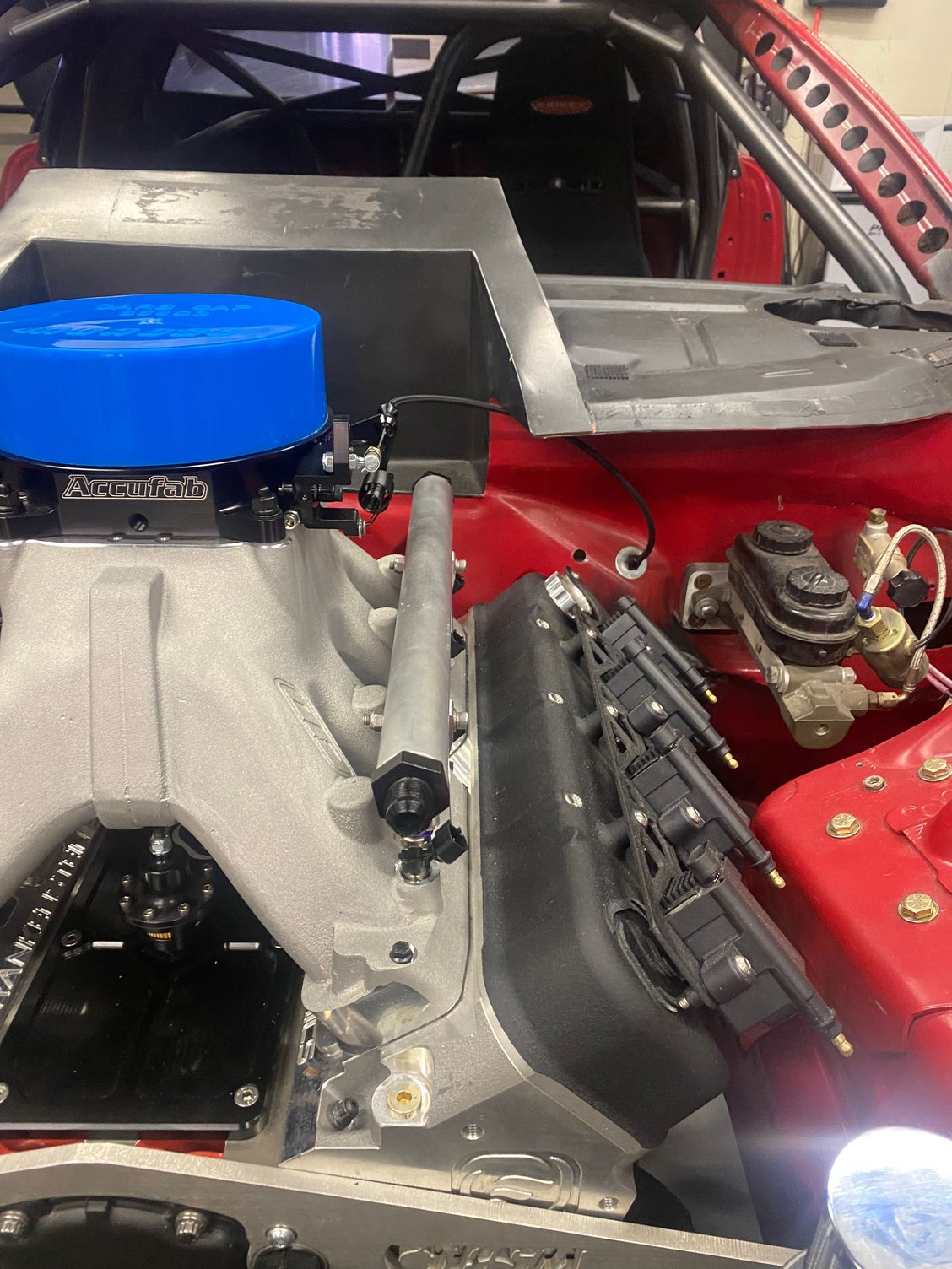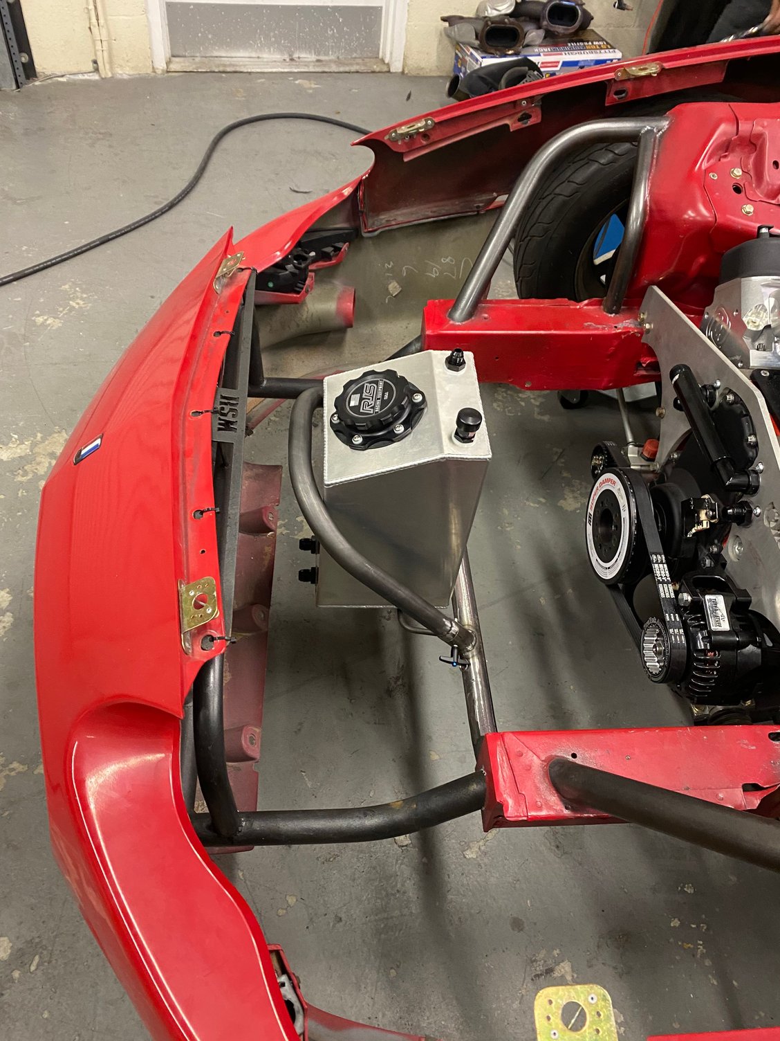Everything was placed for a reason ( may not be the best or what someone else would do). the space behind the shock towers will be for the fender exit headers. Most likely will have to move the brake master inside the car as well. I had many options on where to mount the fuel cell, I wanted it up front because of the ease to just pull the hood and fill it. This also shortened the lines, the trans cooler could have went in the back. The car being NA or nitrous, it’s not going to be sitting on the brake for more than 3-5 seconds. The car will not see any street time, just pull up to the line, and make a pass, that’s it. There’s going to be 2 10lb nitrous bottles and a 15lb fire suppression bottle were the passenger seat would go to help with weight.