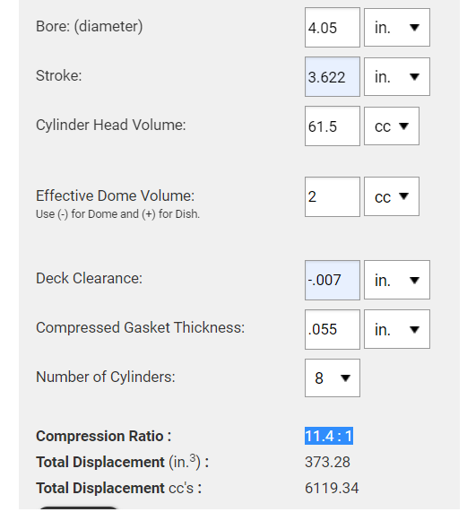 As an FYI our Pro LS forged pistons sit .005" in the hole with a standard 9.240" deck height. Also, decimal point placement is important. The bore size would be 4.005" with .005" over pistons. LS9 head gaskets are .054" per the GM NAL-12622033LS9 head gasket. With all other above compression calculator specs remaining the same, you'd be right around 10.9:1. With 65cc 799 heads you'd be right around 10.4:1. For further info on our pistons check out the instructions page.