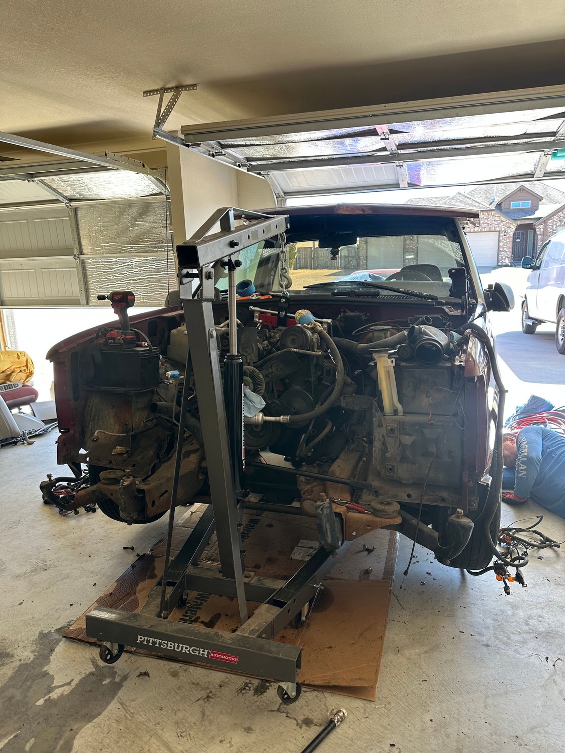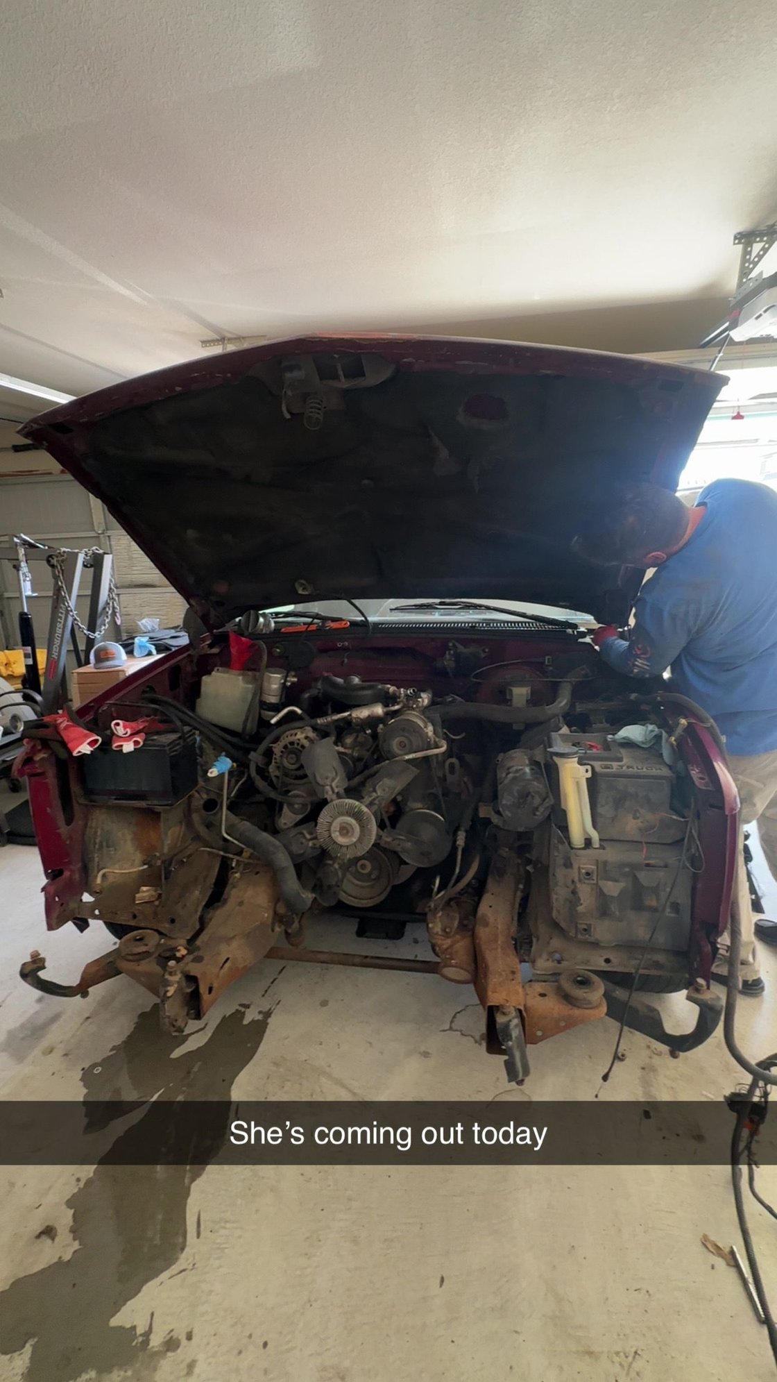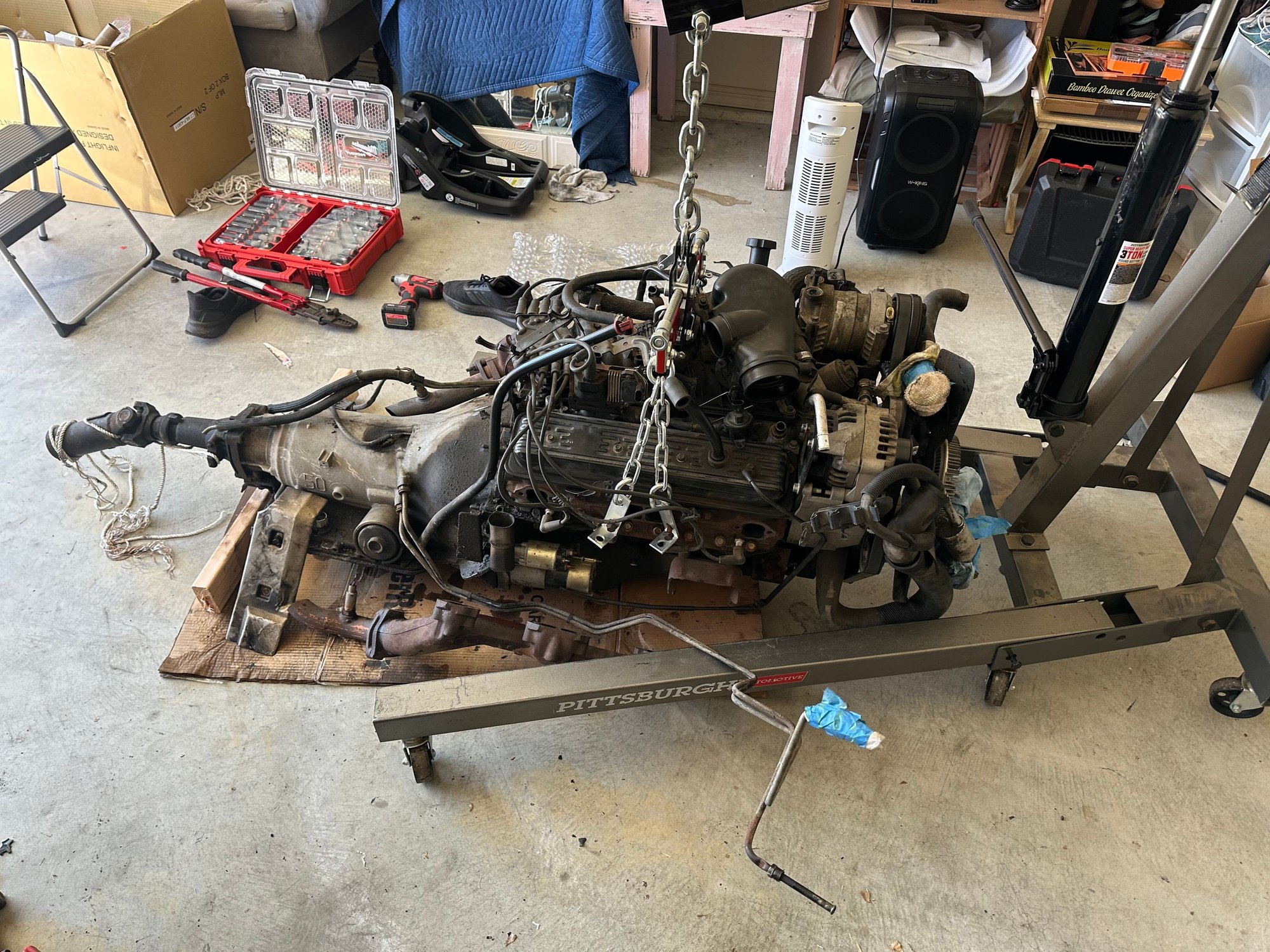 Tonight I finished with removal of core support and now I’m working on minuscule items. Draining fluids is on the list now. Power steering, engine, transmission. From there, its pretty much go time on hooking up the cherry picker and removing this 5.7/60e combo!