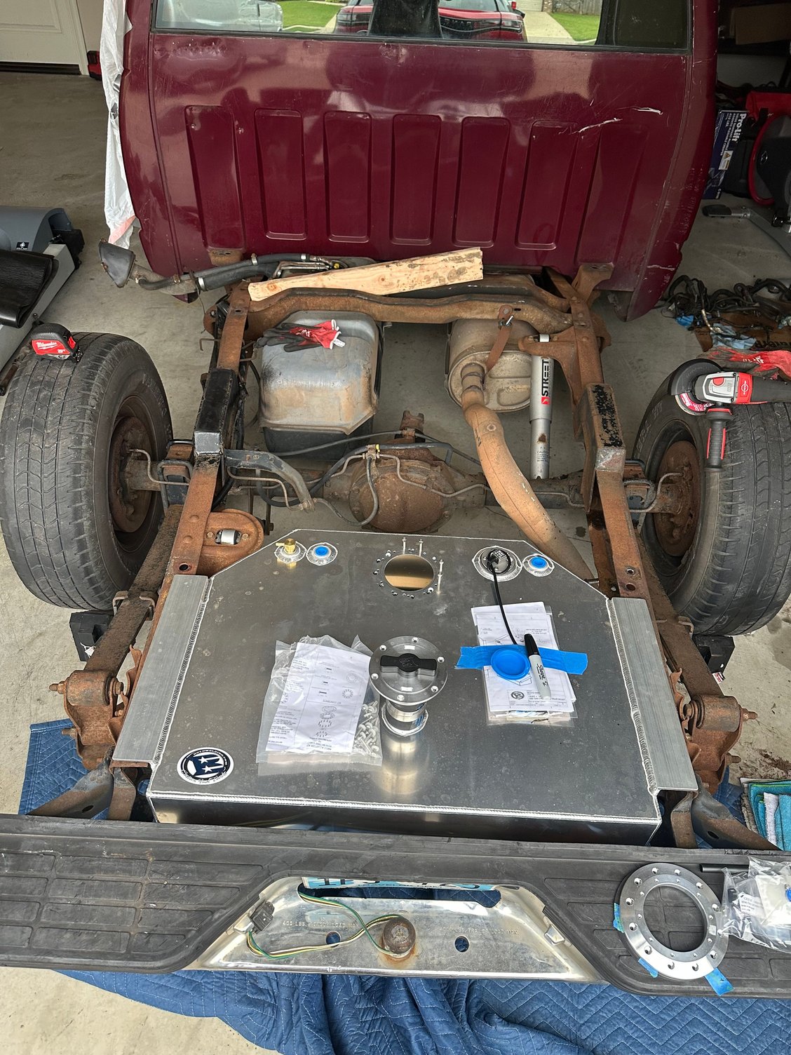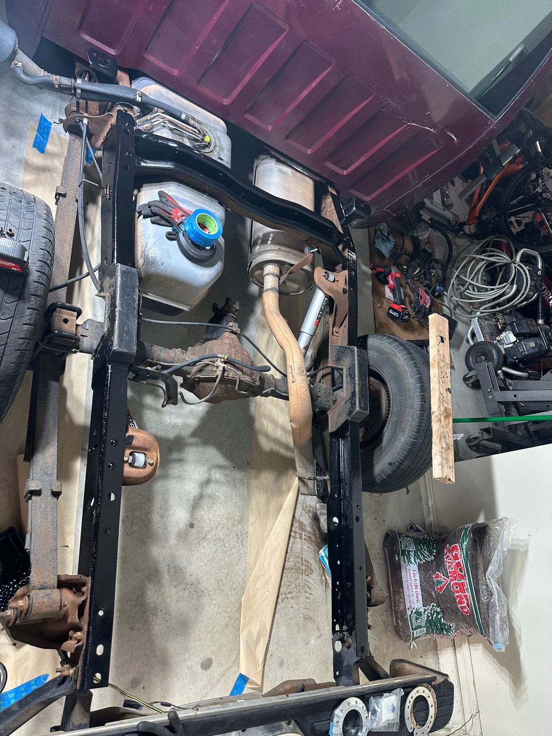 Bed removed and X frame brace removed to allow fitment for Boyd tank. Majority of frame coated also with more Eastwood product. I will wait to relocate shocks and add frame stiffeners once I get a 9” under it. I will slowly start to buy that stuff over the next month or so.