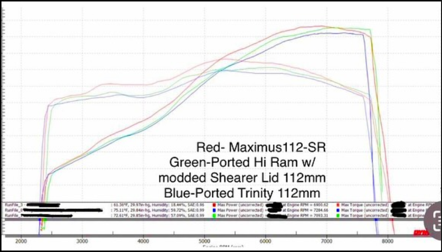 Even over 7000 it still might not catch up. Ironmask posted a dyno graph on Instagram about a year ago that showed the Maximus 112SR beating a ported Trinity with a 112mm throttle body all the way out to 7500 or 7600 where they were about to intersect. No idea if it had V1 or V2 runners on it though or how big of a difference that would make. I also have no idea what the rest of the setup was, but I'm guessing it was a pretty hot setup.
