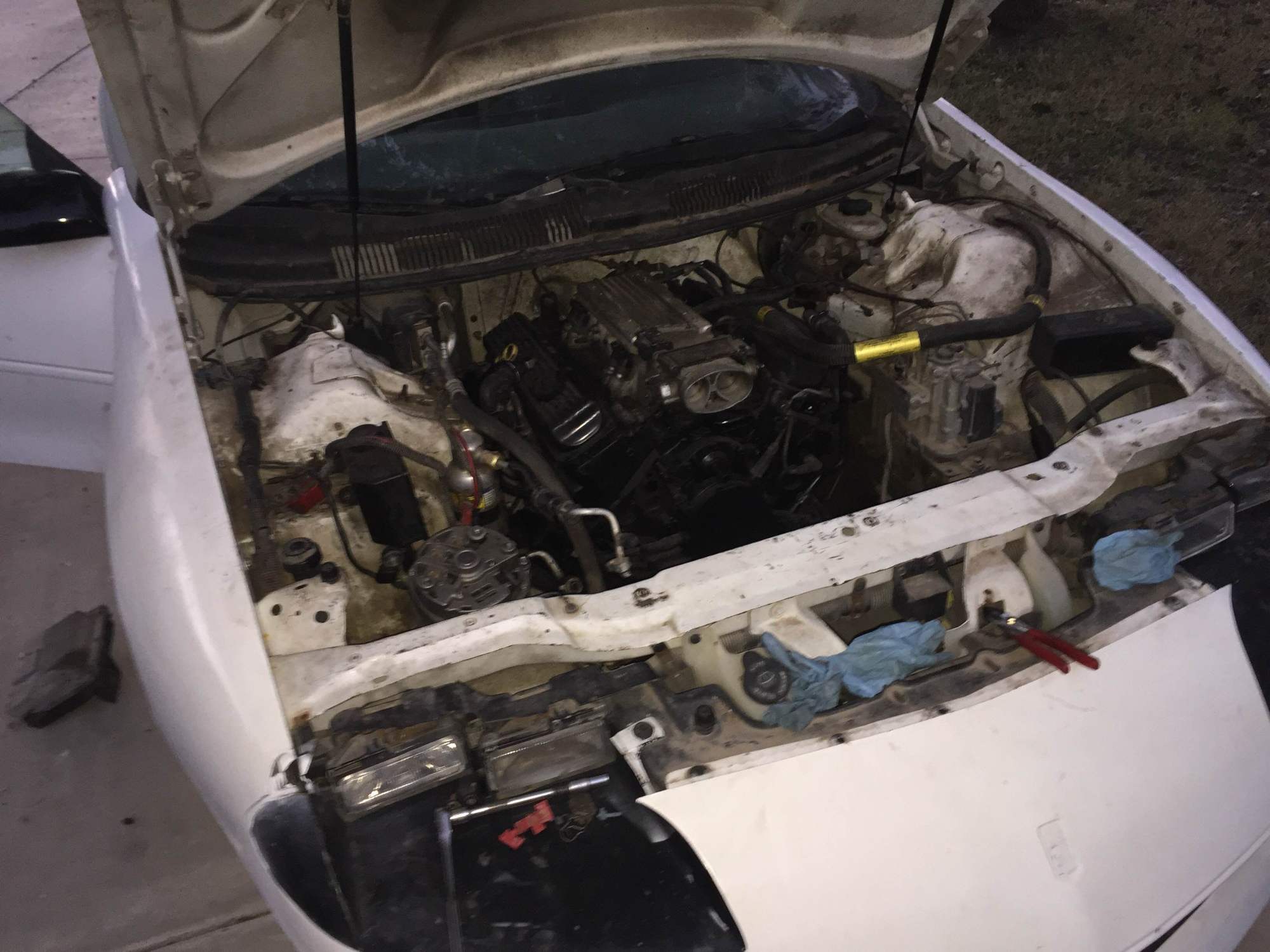 Well I got it home Saturday night. I got her from a kid off cragslist for 1000. The poor guy had spun a rod in his old motor and the shop who said they had an extra laying around installed what I think is an L99 that also ended up having a spun bearing, thing sounds horrid. Those guys also chopped up the harness pretty bad,left the interior and engine bay in various states of disassembly. I pulled the heads on the original motor yesterday, the bores look ok and the pistons indicate its already .30 over. I'm gonna pull the pan tonight to get a look the the rods and crank as its going to machine shop tomorrow morning. I want to rebuild the bottom with some quality parts and install a new valve-train with a larger cam. I'm wanna go as big as I can with stock flowing heads. Its just gonna be a weekend car not a race car but I'm planning on running a 100-120 shot just for kicks.