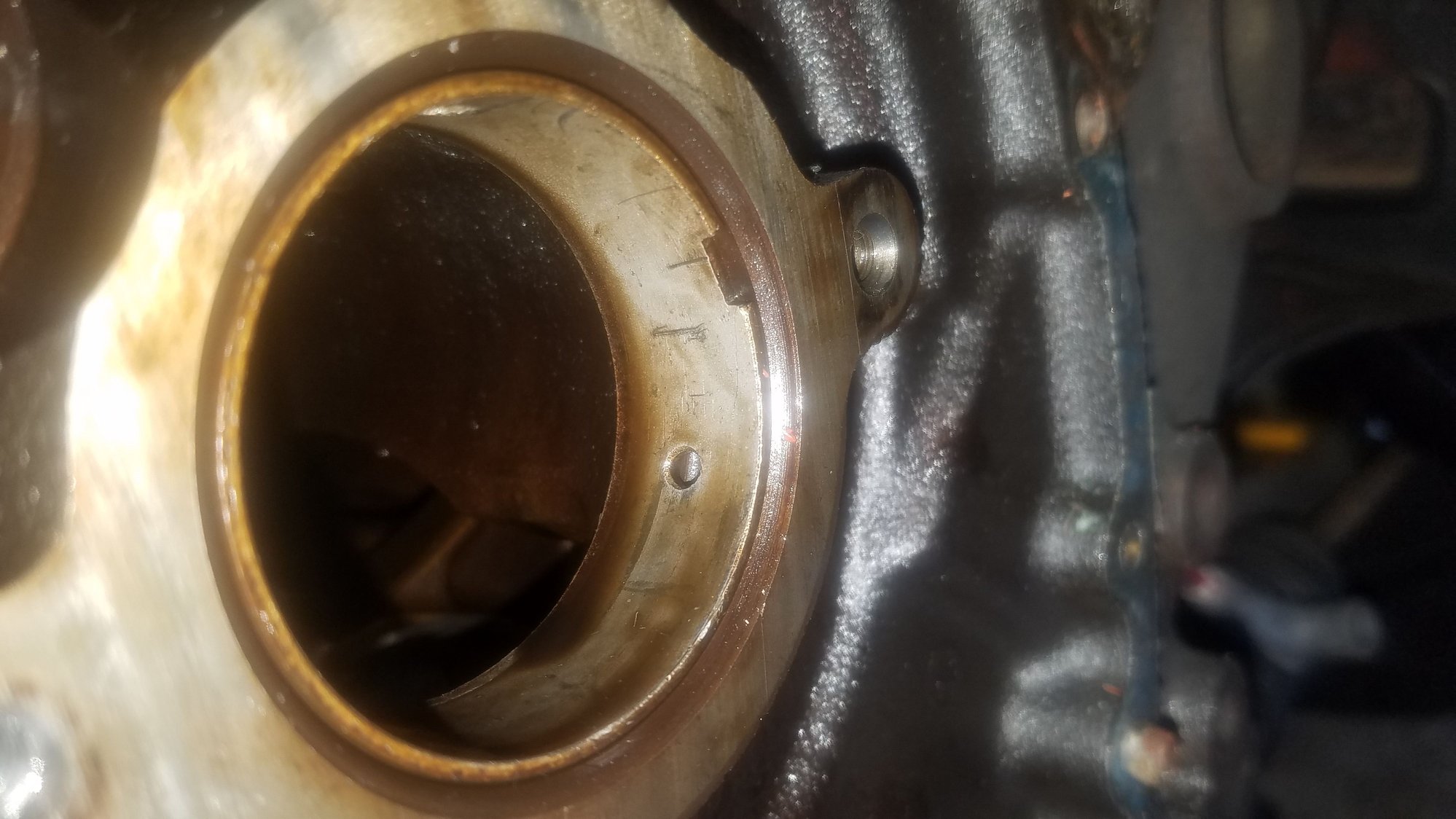 Wipe the oil out and take another pic. Other than scars from a cam install/removal, I think it looks pretty good. My cam bearing didn't have the notch in it though - not saying that's anything to worry about. There does look like a gouge in the bottom, but like I said - wipe the oil out and take another pic
