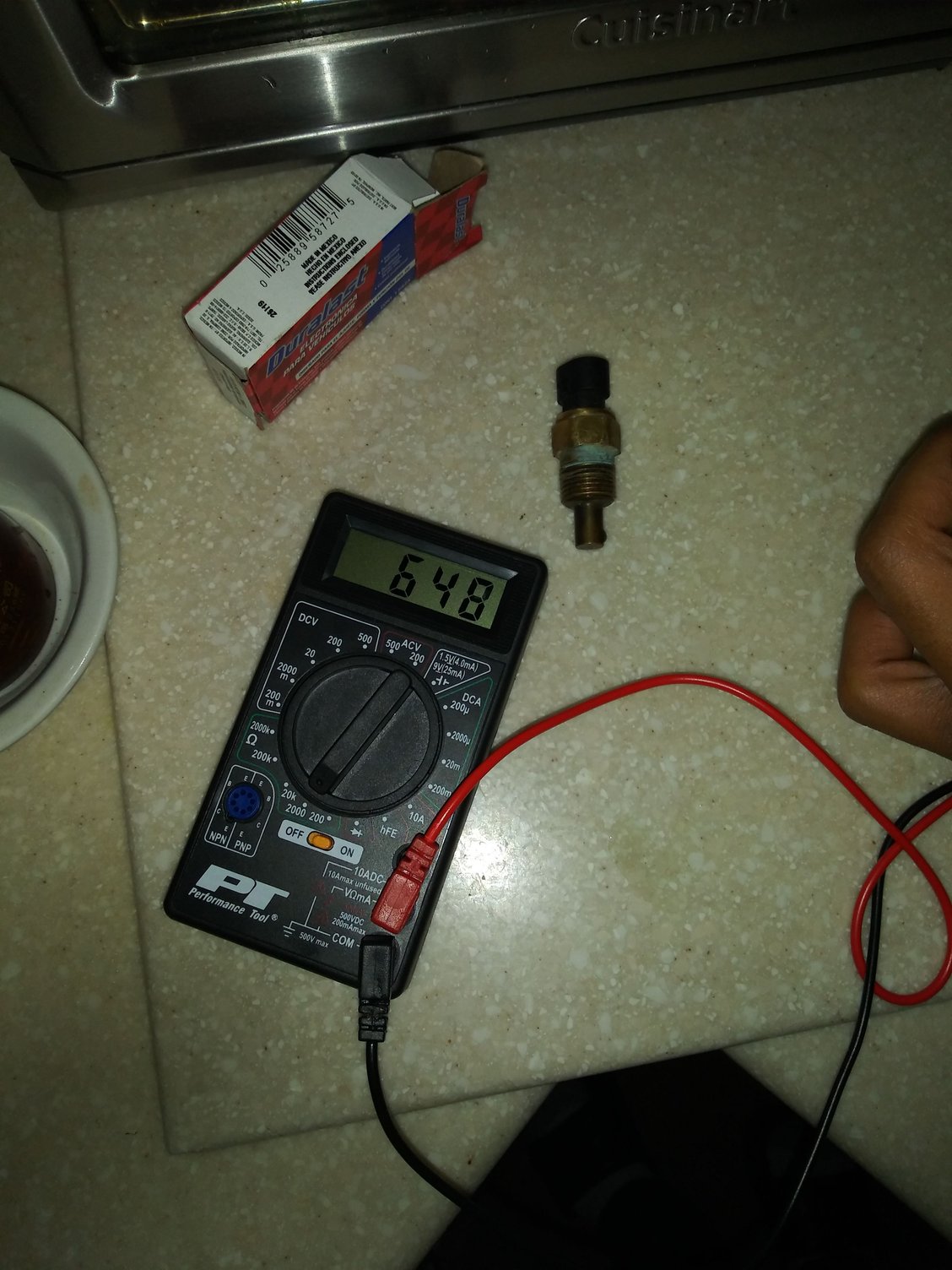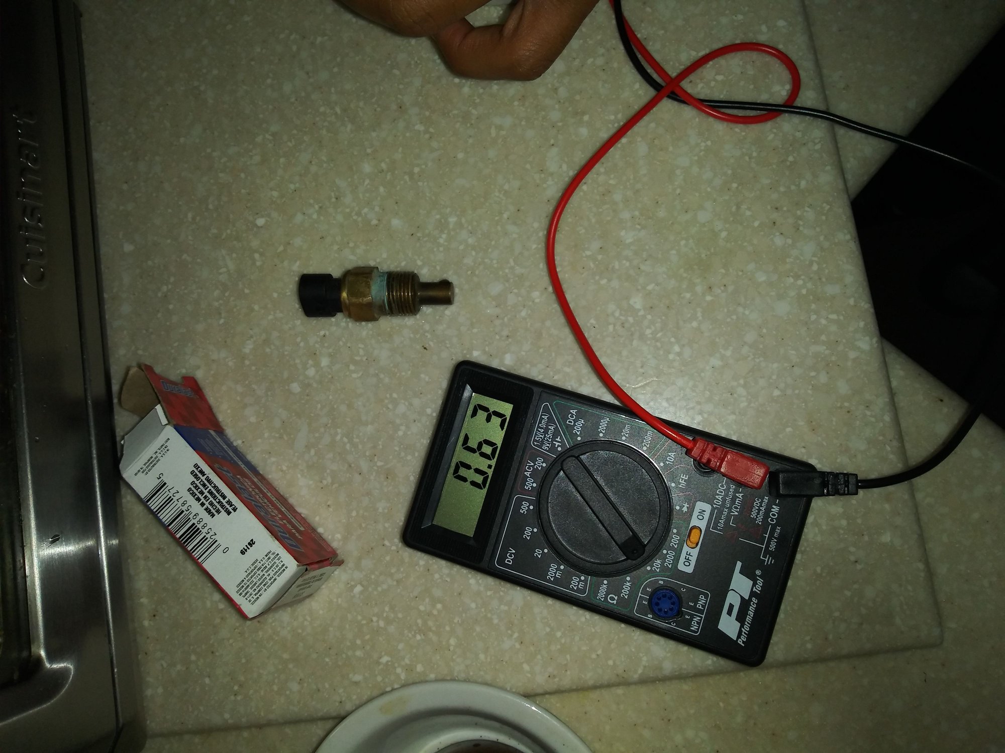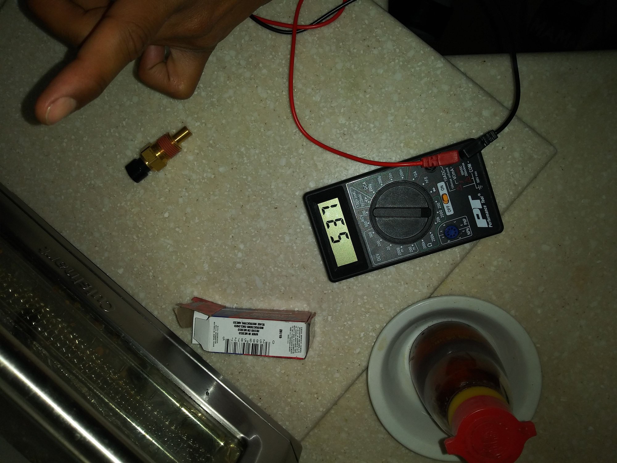 So once I got home I pulled out my old and new ECT sensors to do some testing. I first tested the old one, (20 Ohms) and got a 2.09