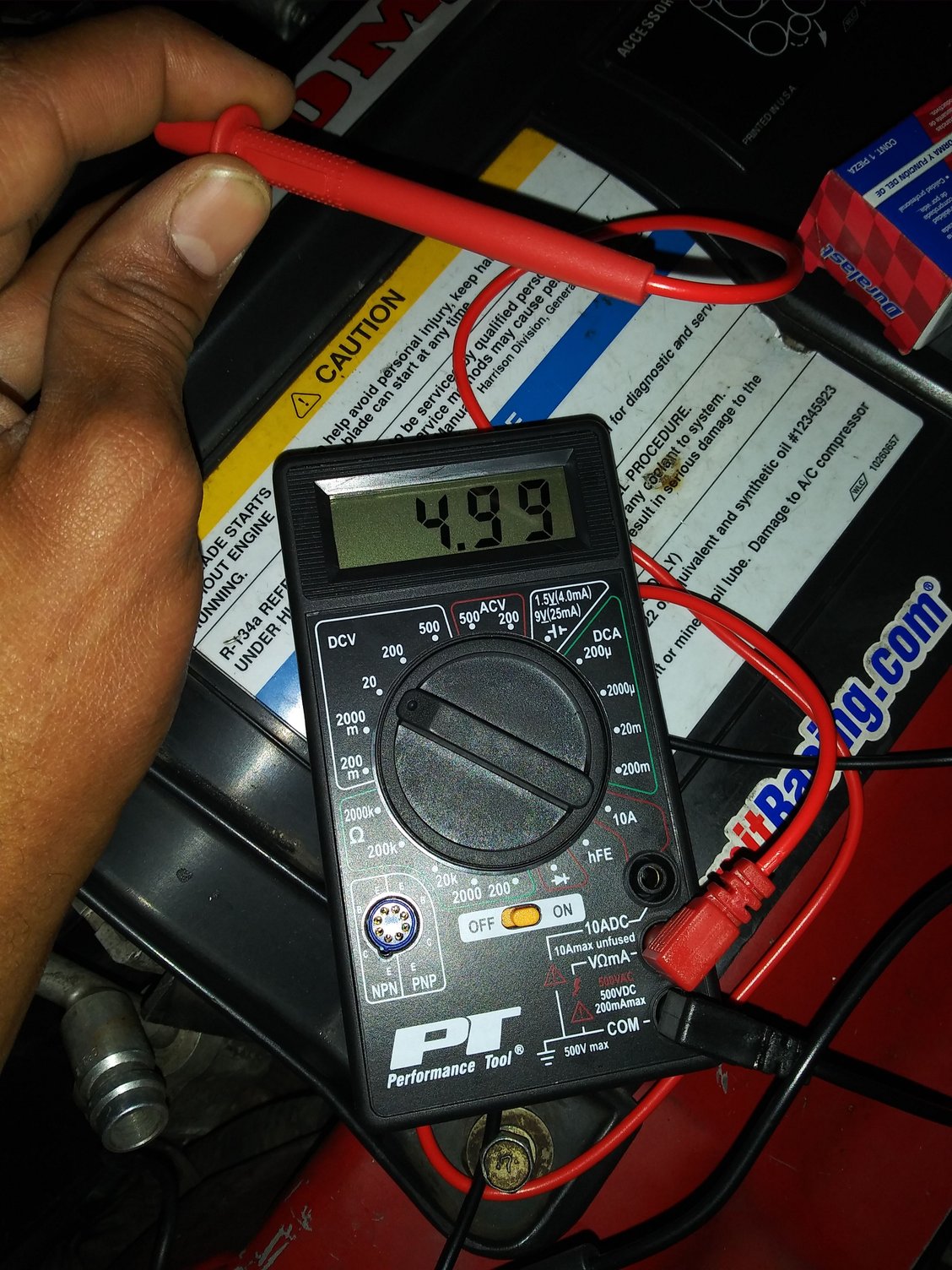 On shbox site, he also say to test the harnesse another way, I should see 5v as stated. I put the black tester into the black lead and red into the yellow wire lead. I got a - 4.9v