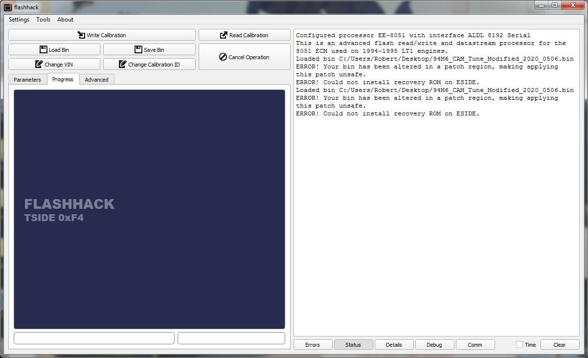 i did get your bin and there is an anomaly for sure in the comms code. i have no idea why and no idea where your base bin came from. i wonder if it's been messed with by some odd tool i haven't played with like read back from a hypertech programmer or something. i did compare against a stock calibration. i'm unsure if the recovery patch will be safe to apply. if i were you i'd start with a new virgin bin and copy the relevant tables over, but otherwise just uncheck 'apply hardware recovery logic for the e-side' like i mentioned earlier and it should be fine.