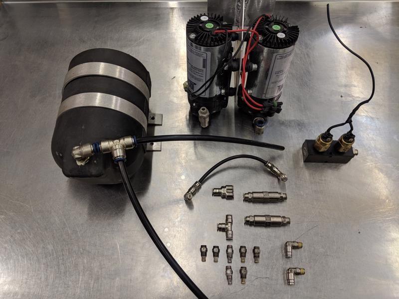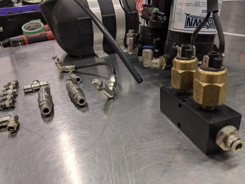 Water methanol kit came off the same car, used it for 2 seasons. Pumps only have one season on them, both from Devilsown and these are the awesome 300 psi pumps. Were washed out with fresh water before stored. Mount works great on the inside fender of an F-body. Comes with a vacuum block with dual hobbs switches. I turned on one kits at different times. Tank is from AIS with 3/8 line outlets. 2 check valves, and 2 different style T's. Jets included single 25, 18 (which is used for pre-turbo) and 4. With two 7's, and four number 14 jets. I had many different setups that changed with weather. Use the kit anyway you want. Many pieces to build anything you want. 400 shipped