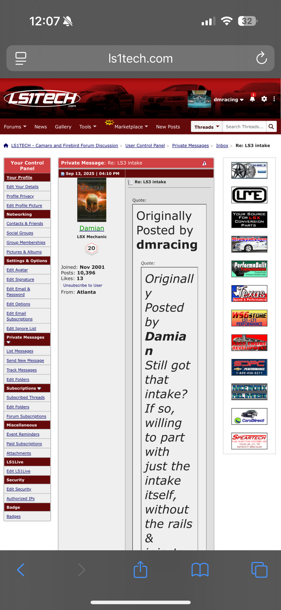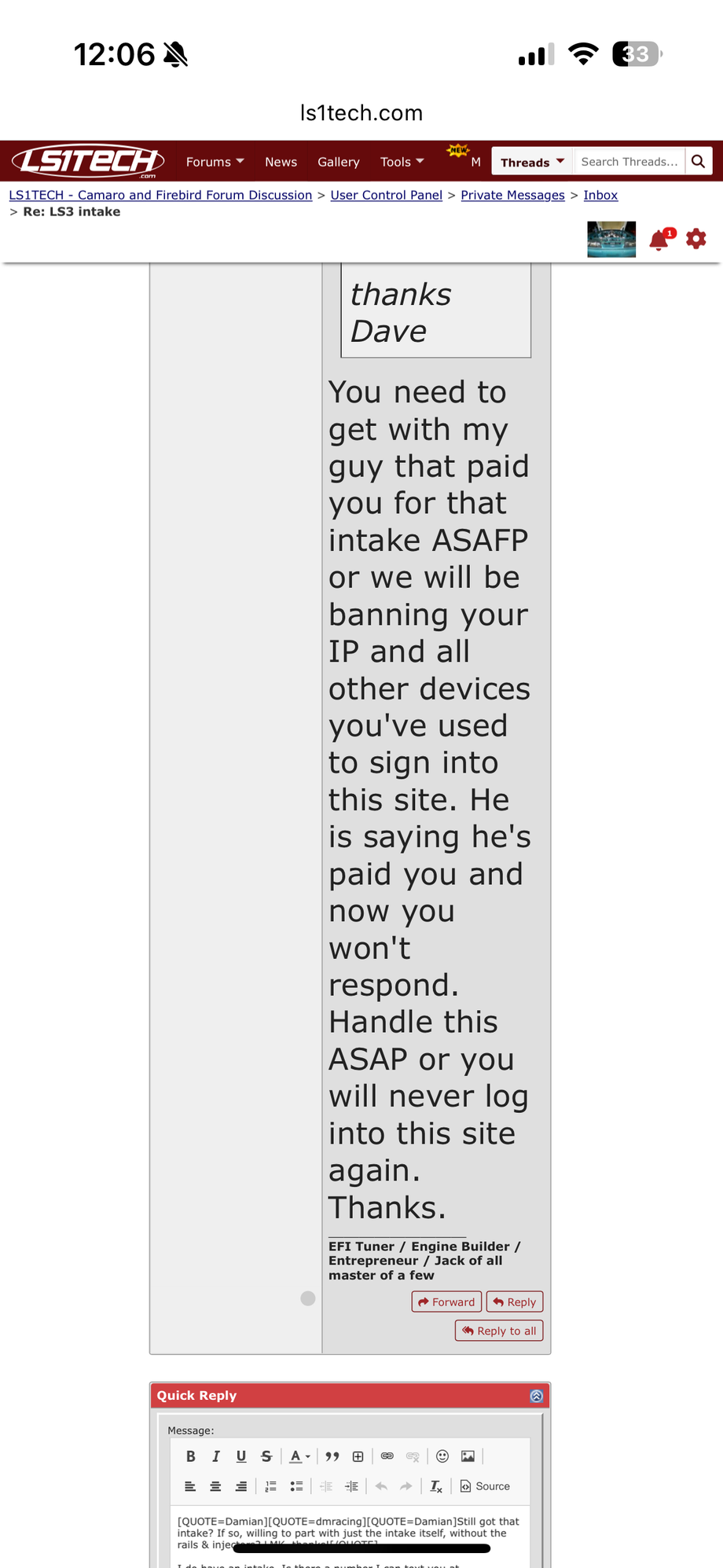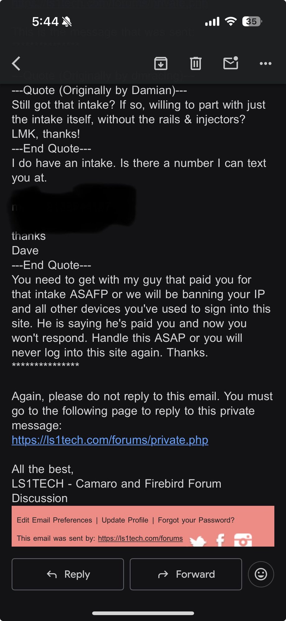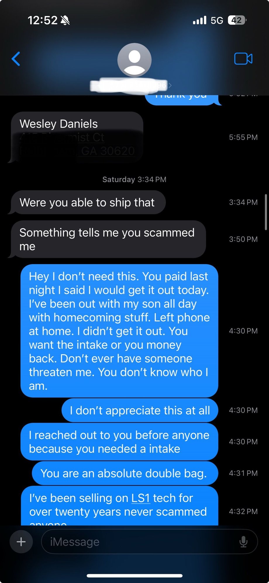 Please avoid selling to these two people. I had Wesley Daniels send me money on Friday about 5:50pm. Asked me to ship a LS3 manifold Saturday. I said I could. Saturday I was out shopping and in and out with my high school son for homecoming this weekend. And one stop home I forgot to take my phone with me. During this short time. Wesley texted me and asked if I was able to ship the intake at 3:34pm on Saturday afternoon. Very next day. I didn’t have my phone. So I couldn’t reply. Then at 3:50pm 16 minutes later he accused me of scamming him and stealing his money. Also during this time his friend on here Damian sent me a pm telling me I better ship asafp for I’ll never be able to log on here. I got home with my son shopping. A little before 4:30. I grabbed my phone to get Wesley address and found out in that short amount of time the very next day I was banned. I couldn’t log on. So he was able to ban me. A member of almost 20 years with over 2000 posts and itrader of over 80. In less than 24 hours of taking his money. I returned his money to him. All in less than 24 hours. I was afraid to put this thread on here out of fear of being banned again. Seems like you can get banned for the wind blowing. But I would avoid these two at all cost.
