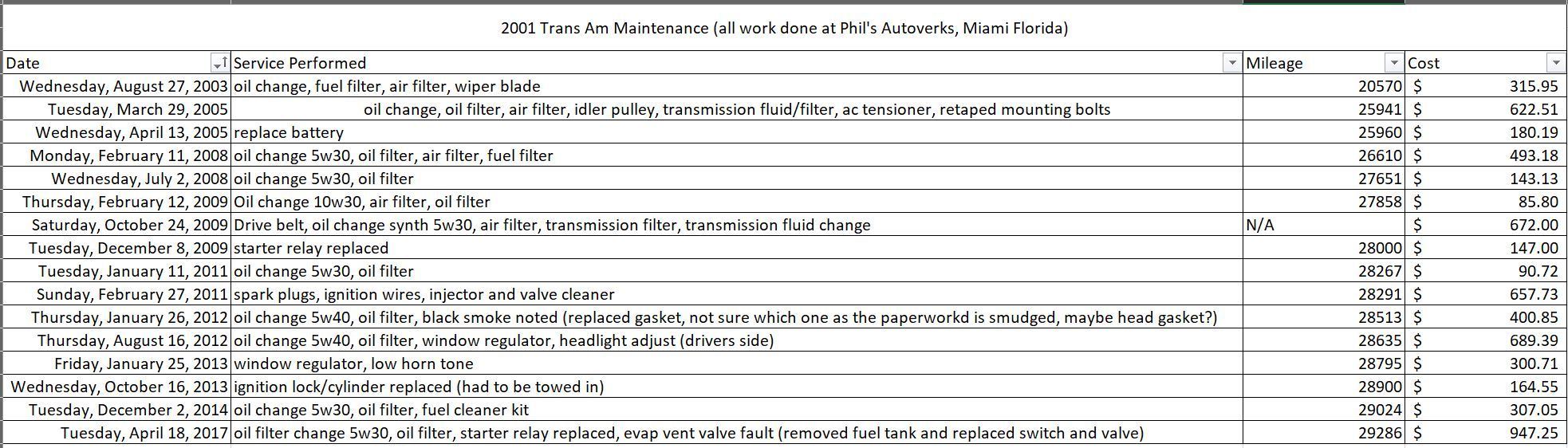 I am somewhat of lurker in these parts but recently purchased a 2001 Trans Am WS6 A4 from Sherman Texas, I actually drove it back home to Florida (just arrived this morning at 7am, long drive!) While she handled well, I did notice she ran a little rough (mileage is 29k), I have some very good recent service records from the previous owner (I put them in excel format and will copy paste them below). Question for you all? What are some of the things I should be looking out for and swap to make this a more smooth running car? It has door panel cracks which I expected and was disclosed prior to the sale (I had a mechanic I hired to check it out before I bought it). He gave it very good reviews both mechanically and cosmetically but did note it ran a little rough. The drivers side headlight seems like it gets stuck against the hood and won't come up, when I open the hood then turn on the lights it will opens and the lights work, I can then close the hood (when I turn off the lights they go down without issue or rubbing on anything).