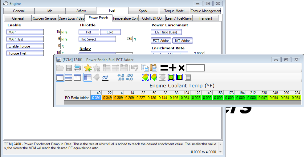 Then, go into the power enrichment table and find ECT adder table. Let's say we trick the ECT sensor into thinking it is hot...at the top end of the table 284, I can add as much fuel as needed to make the wideband happy