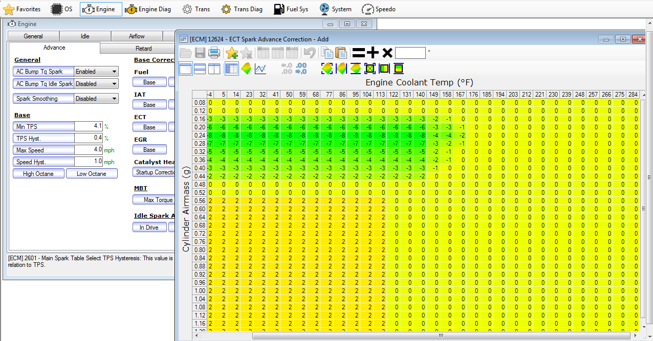 Then for timing control, find the ECT Spark Advance Correction, and again at the top of the temp range 284, change however much timing I need.