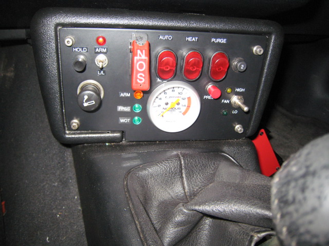 Here is a photo of the nitrous panel I fabbed up. Definately not too stealthy, but it works well. It also incorporates my line lock and fan over-ride.