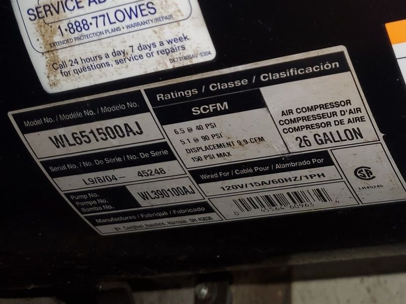 I went out to the garage, dug it out, and here's the label. Campbell Hausfeld WL651500AJ 26 gallon (bigger than I thought). The CFM rating doesn't look too bad. Comparing it to the D1 gun specs, it should do just fine as long as the compressor is functional.