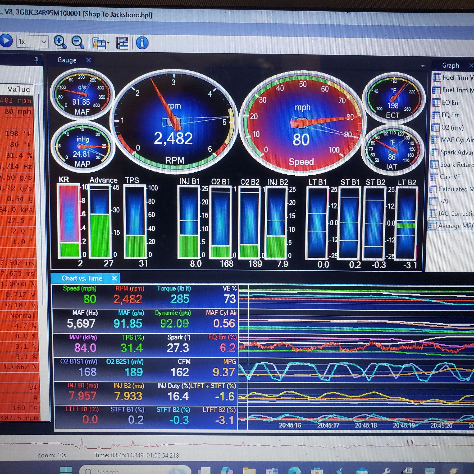 I had just a little too much timing climbing this long grade. I heard it ping on one bank a few times with the knock phones then instantly went away when the PCM pulled advance.