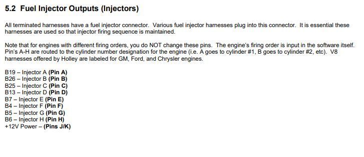 It's all on the Holley website and it really doesn't matter what harness it's all on the outputs of the ECU, You can literally make your own harness with the diagrams they provide. If you know how to read a wiring diagram then it's simple to figure out what goes where even without a color code.