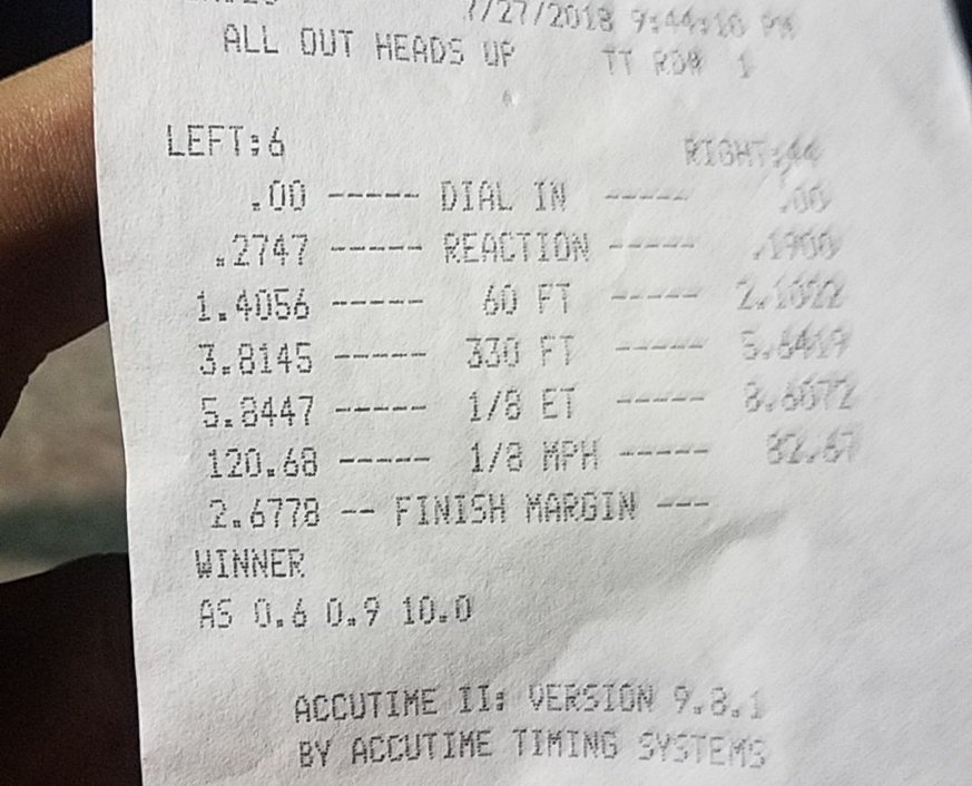 The next slip has a better ET which was this year. Rebuilt engine with a full forged bottom end so we started to turn it up. This is maxed out on my S482. 22psi is all it has with the current setup. It was on a no prep so it slipped a little in the 60ft. Should have been about .2 of the ET with a good hooking track.