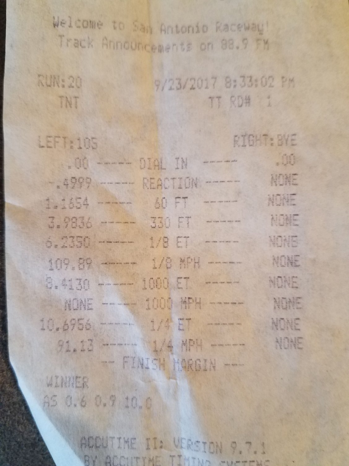 I dont have any 1/4 mile slips because these events are all 1/8th mile. But it should run in the mid 8s in the 1/4