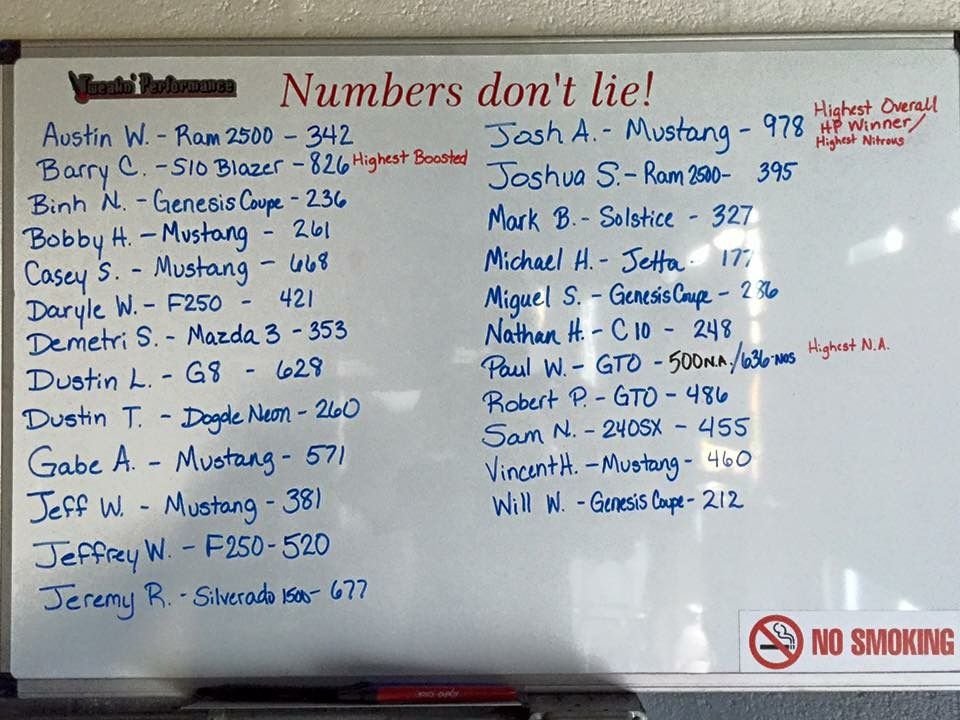 The results from the dyno day Saturday. All the Mustangs above the 460 were full on race cars. The 460 was a 5.0 on a 100 shot.