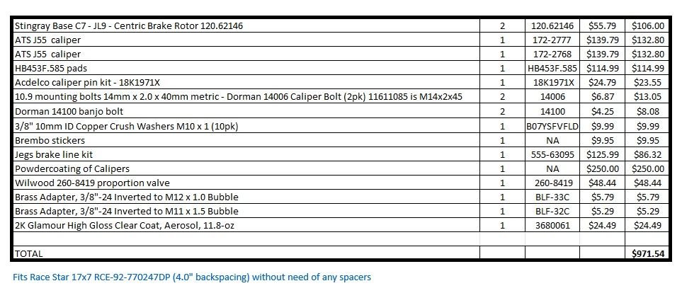 I went with the ATS setup. All new brake lines were ran. In addition to the parts below, I needed (4) 20 Deg Side Bent 3AN To 10mm 3/8" Banjo / Brake Line Fitting Adapters.