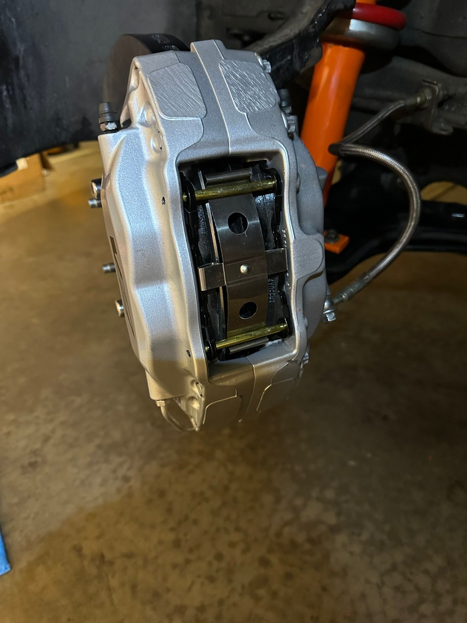Spacing with M12 Big washer thats 3mm thick. One on each bolt between knuckle/caliper.