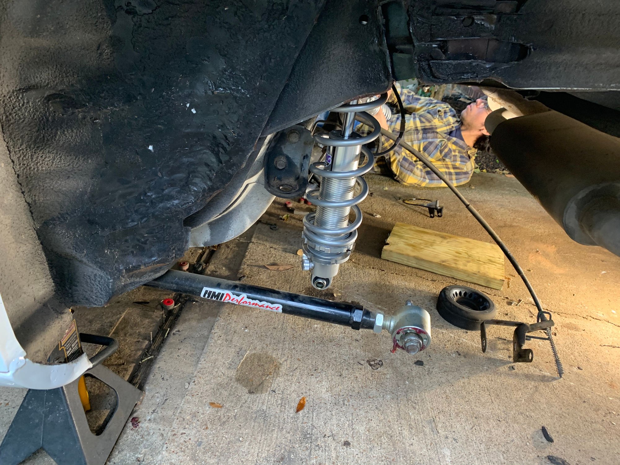 Today we finished up the front brakes, coil overs, and upper control arms. We took the rear end and torque arm out. Installed the driveshaft loop and Strange driveshaft. Had to stop for the day.