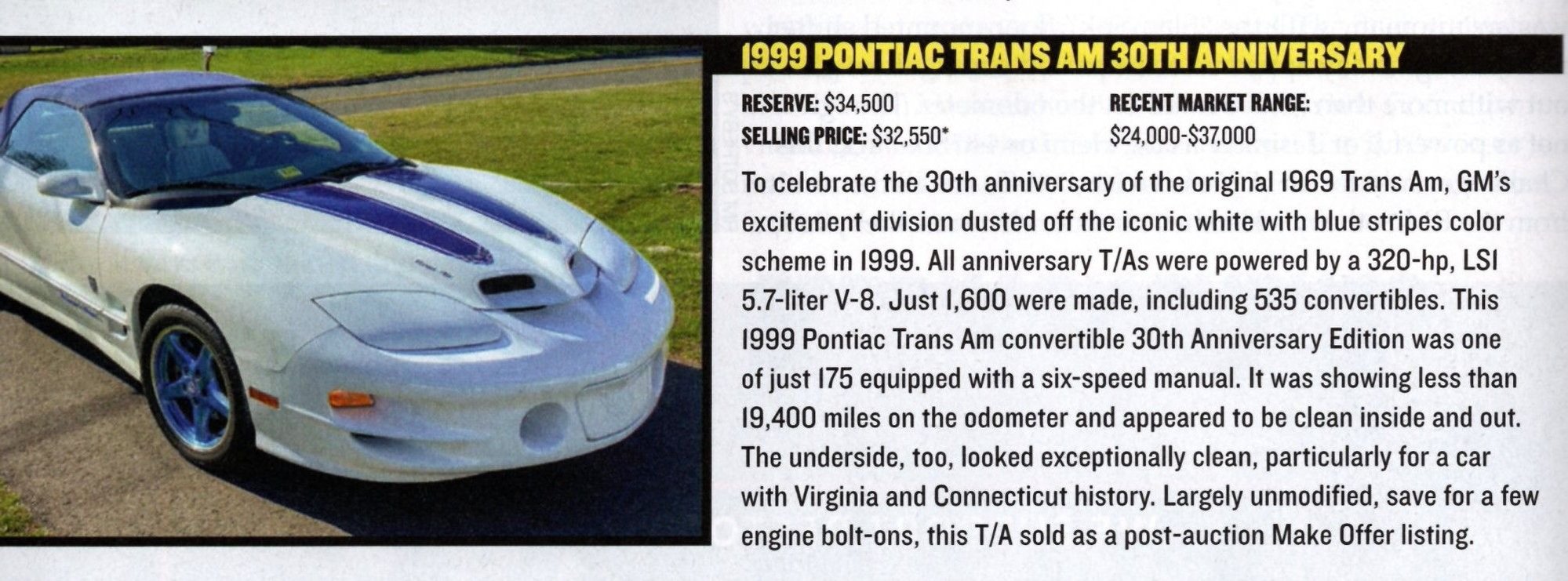I remember when both the CETA and the 35th came out. I fell in love with the 35th. In 99 when the 30th came out I was pumping gas at a full service gas station and a brand new vert pulled up. I walked around it for 15 minutes at least while they were inside. I said then one day I would have one lol. I still don’t have one. The yellow on that and Ram Rumble Bee of the era were interesting shades. I loved all the black on it, but the I just was never a yellow fan. I agree with you tho that will forever be the ultimate last TA. I am really surprised they aren’t bringing more money seeing as it was the last Special Edition Trans Am ever. Maybe in 2 years when it hits the 25 year mark? We will see what the market does. You would think tho with the modern appealing that the CETA car would be more appealing because they 30th was kinda out there for the time. It looked futuristic for its time I thought. Still I think if I were to buy either one the 30th would easily be my choice.