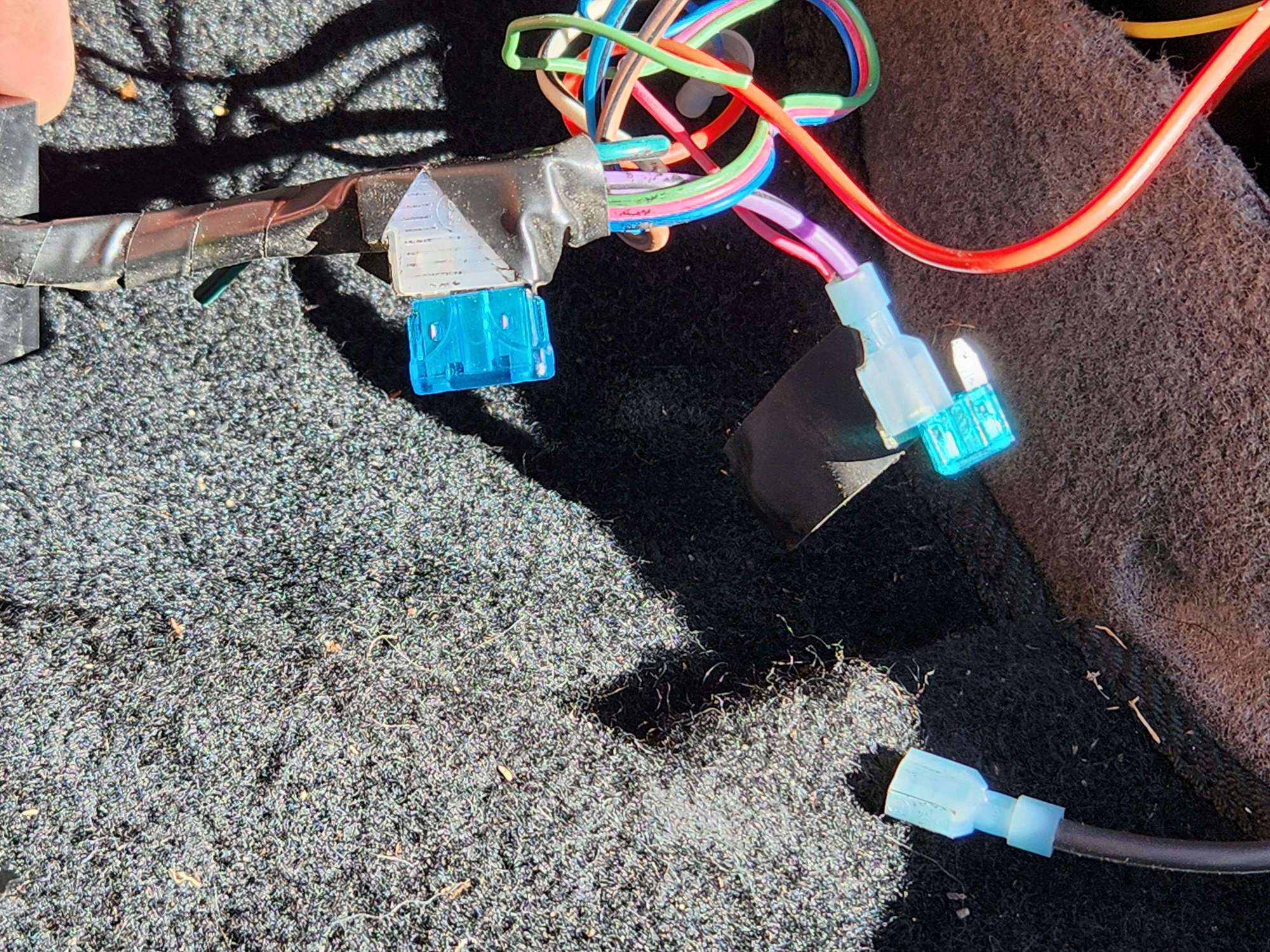 Hello.. I'm trying to put some stuff back together on my 2002 Camaro z28, and I found a weird wire with a fuse sticking out of it. The other side of the fuse is not attached to anything and I see a black wire hanging out nearby. I'm trying to figure out if the fuse is supposed to attach to the black wire but I cannot find any information on what the wire is and what it's supposed to connect to. I've looked through all the wiring diagrams I can find for the car and can't find this wire.. It appears to be purple with a black stripe, and it is located on the right side under the passenger side glovebox. I've attached a couple pictures of it below. Does anyone know what it might be? Maybe something somebody installed at some point?
