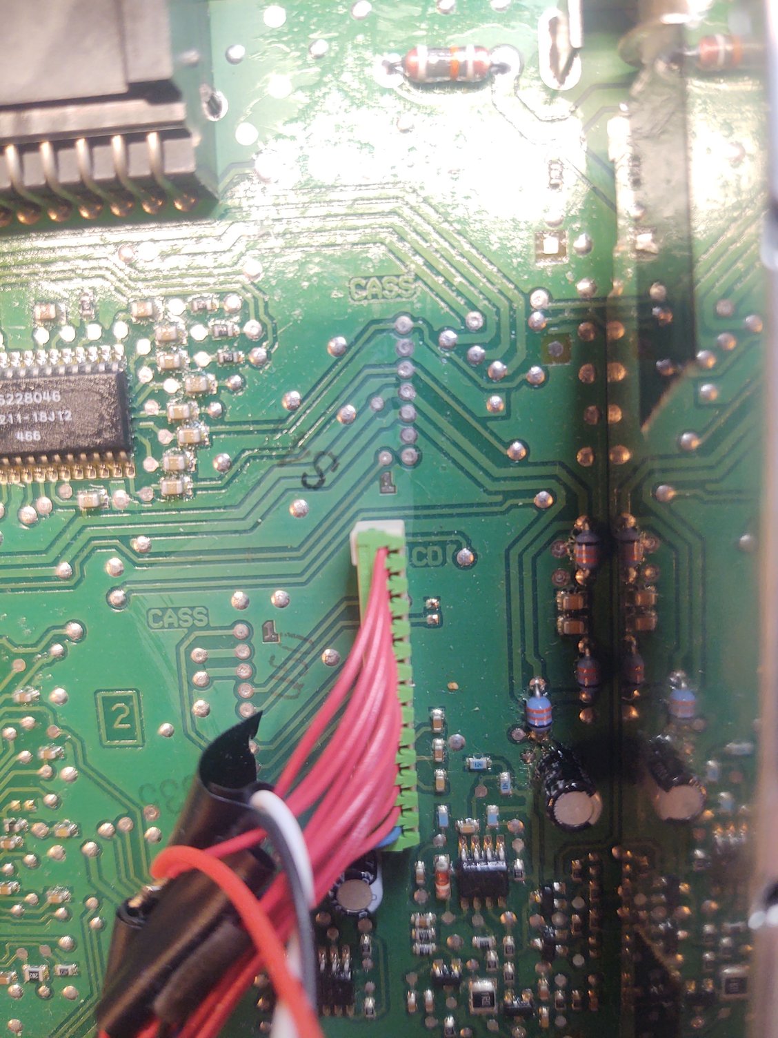 So I attempted to follow the "How To" guide (link at bottom for convenience) for splicing an AUX input into the CD player of my head unit and everything just kind of went **** up. After getting my bottom cover off, which used a completely different number of screws than the tutorial, I was greeted by this random PCB board. After taking off the heat sink and some extra screws on the sides, I managed to get it off and... well, I found this. It doesn't look anything like I expected, so I ended up having to read the board underneath to confirm (I think) the location of the L and R channel wires. I had to assume the wire between them was the ground, but who knows. The power wire was a crap shoot. I followed the tutorial and spliced into the 7th wire from the "front", where the L channel wire was, hoping it was the same.