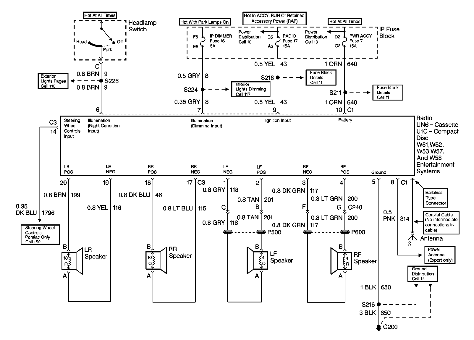 However, unless the installer of the Pioneer head unit completely rewired the entire audio system, the primary connectors would still be in use. Even if they went with an aftermarket amp and speakers, the two power wires, ground wire, dash illumination wire, steering wheel controls, along with the power antenna (Firebird) or speed controlled volume (Camaro) would still be used. Usually an adapter harness is connected to the aftermarket head unit so that it plugs into the factory connector.